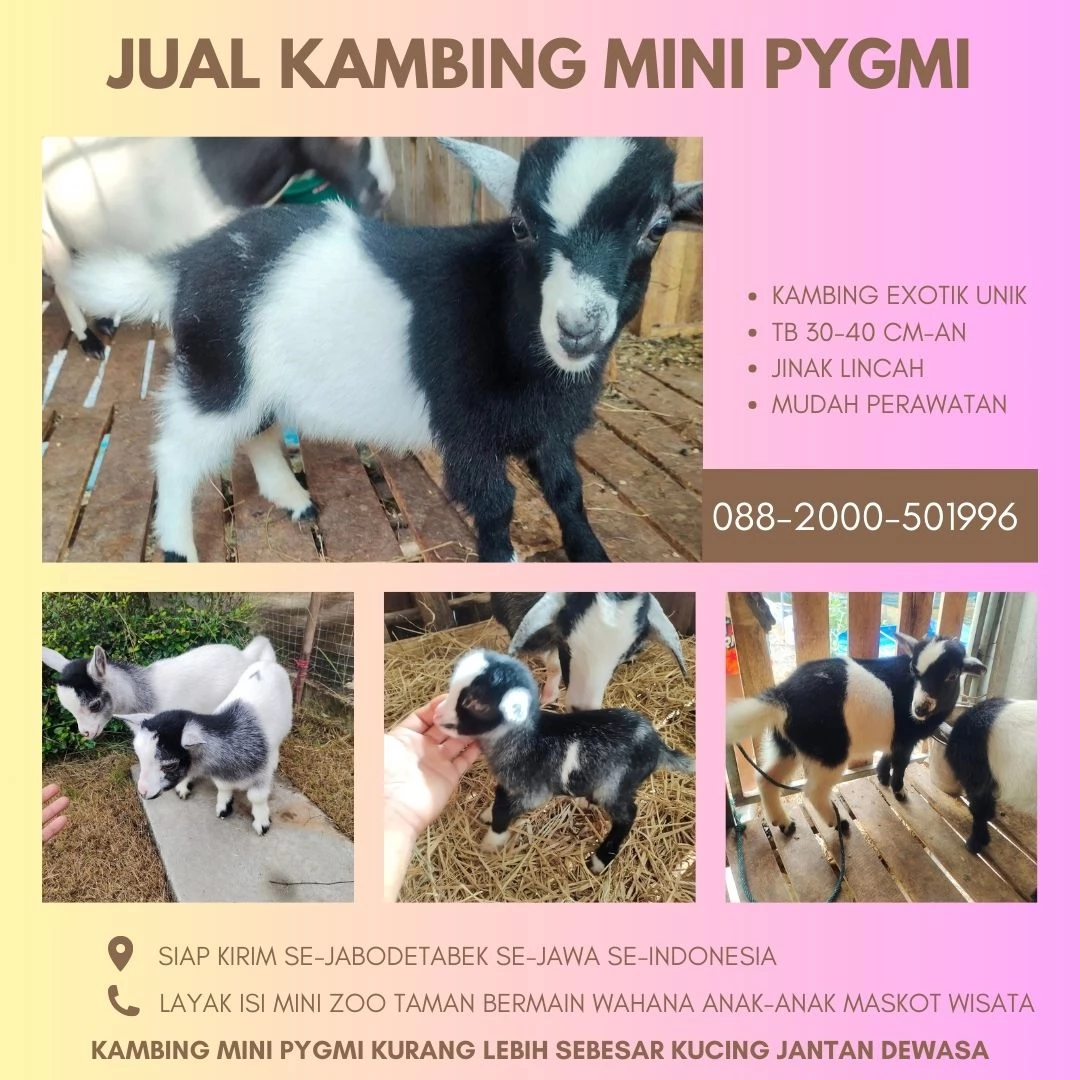 Kambing Pygmi adalah salah satu jenis kambing terkecil di dunia, dengan tinggi badan 30 cm saat kecil dan bisa mencapai 40-50 cm saat dewasa. Mereka dikenal karena perawakan yang pendek, tubuh yang kompak, serta sifatnya yang jinak dan lincah. Dengan usia 4 bulan, kambing ini sudah lepas sapih dan siap untuk dijadikan hewan peliharaan atau aset ternak.